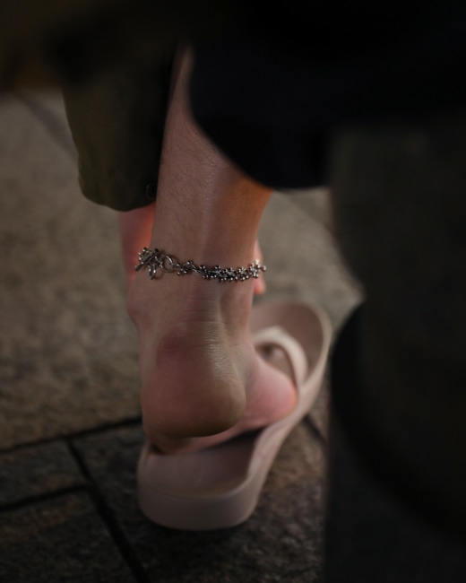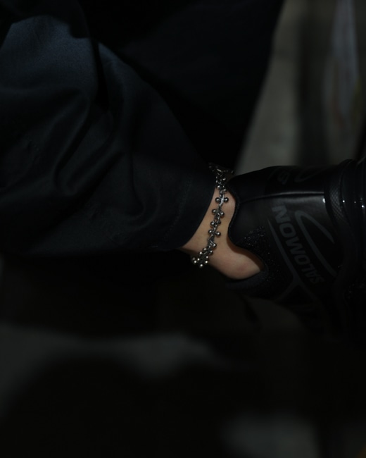 従来のブレスレットよりも長く、さらには三段階のサイズ調節パーツがデザインとして施されているため、みなさまの足首に装着可能。