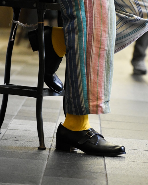 デザイナー曰く裾幅の細いパンツに合わせて頂きたいモンクと。