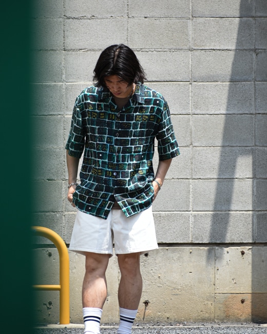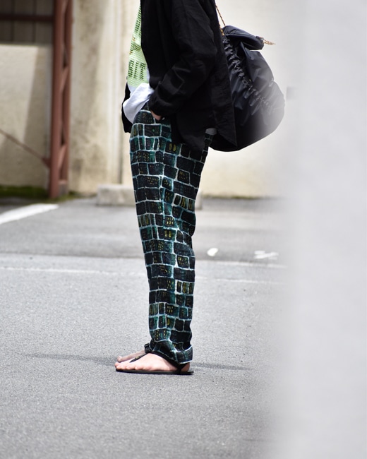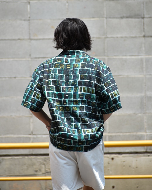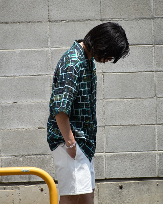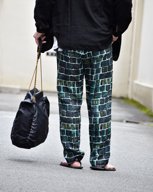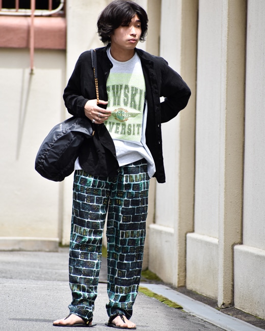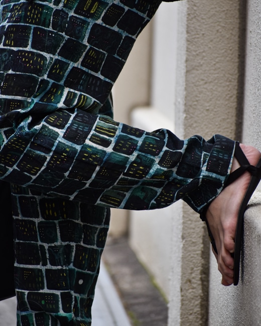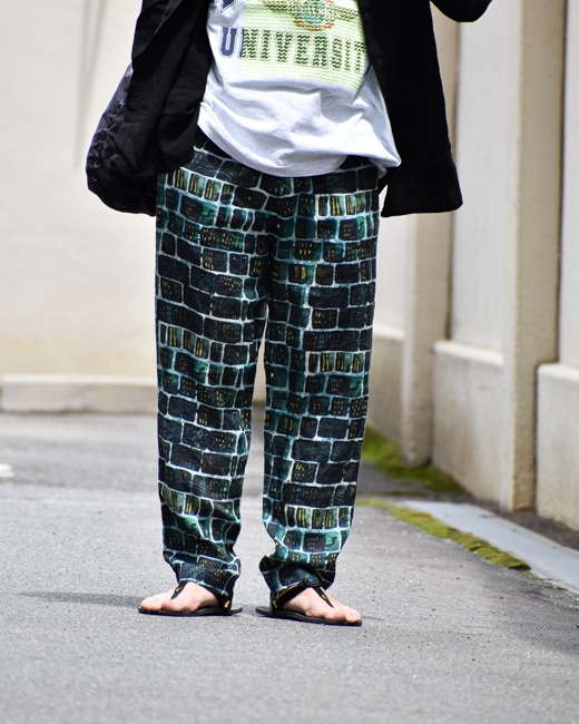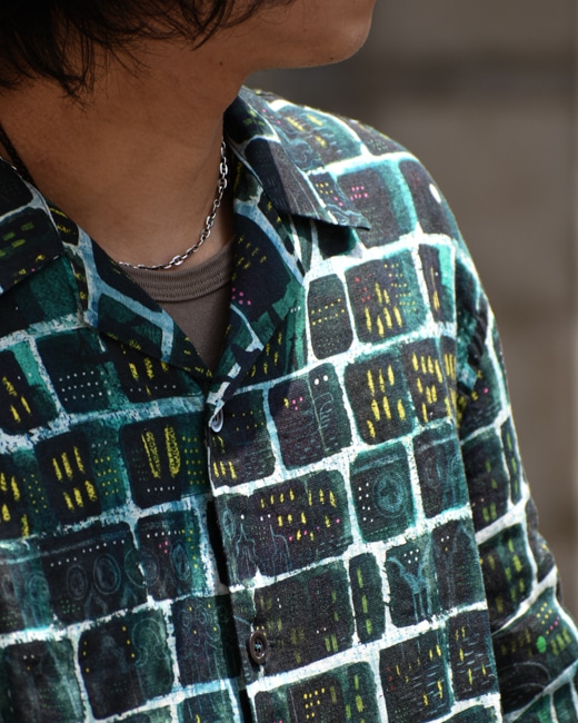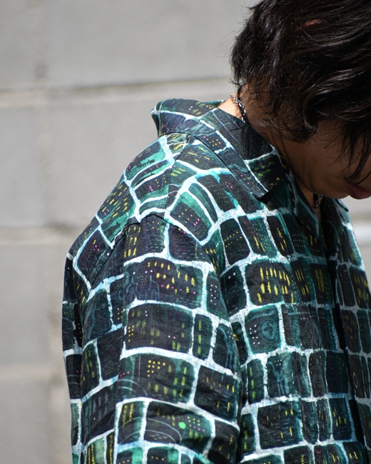 特徴的な柄がインパクト大な一枚で少しゆとりのあるシルエットとダークトーンのベースカラー
