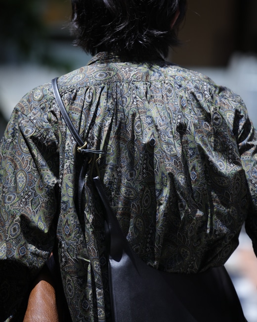 背面のヨーク部分にもギャザーが細かく入り、リラックス感のあるサイズ感もムード満点で◎。