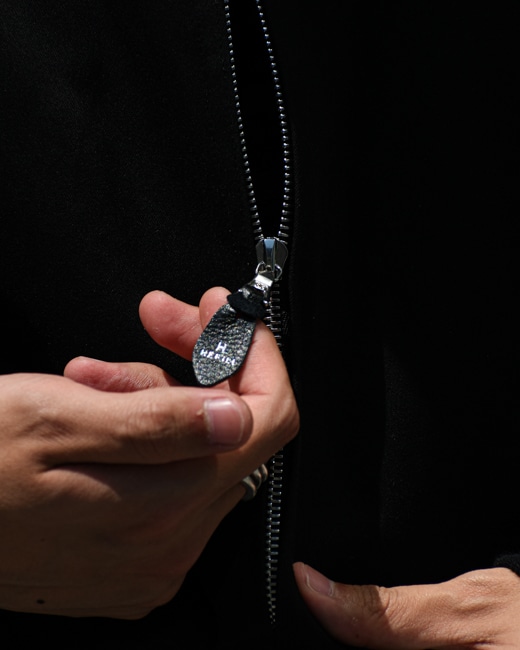 フロント、ジップ部分のジッパーはあえて目立たないようにムシ隠しを行い、裏地には上質なキュプラの総裏仕様で