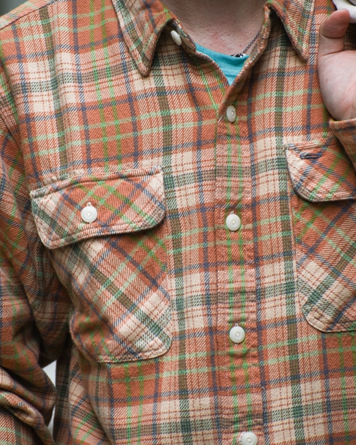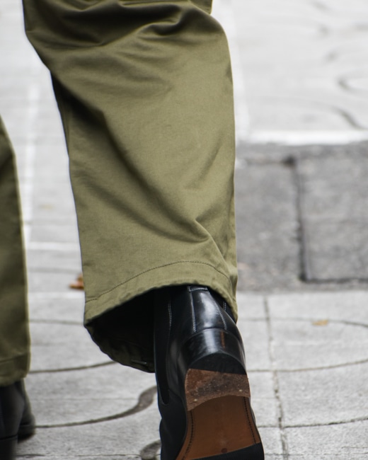 型が持つ余白感と素材が持つ特性の相性が良く、ワークウェアの土臭い側面とタフさ、そして品のある表情を