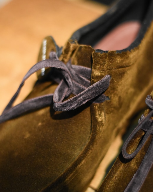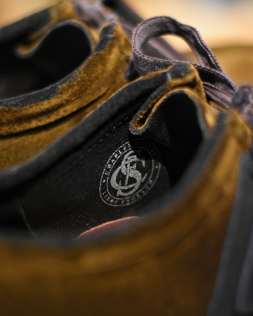 アッパー部分とクレープソールにスプレーでピグメント加工を施し、ベロア調に。