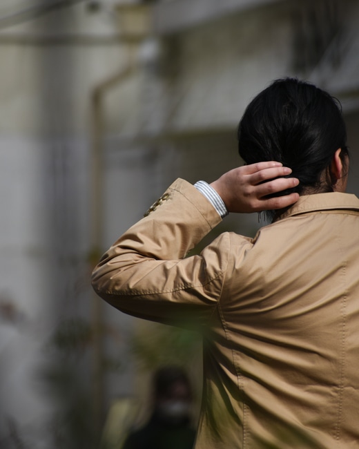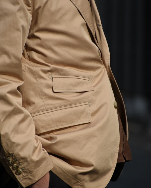 ジャケットやオーバーサイズのニットなどの上からもざっくり着れるカマの広さと身幅。