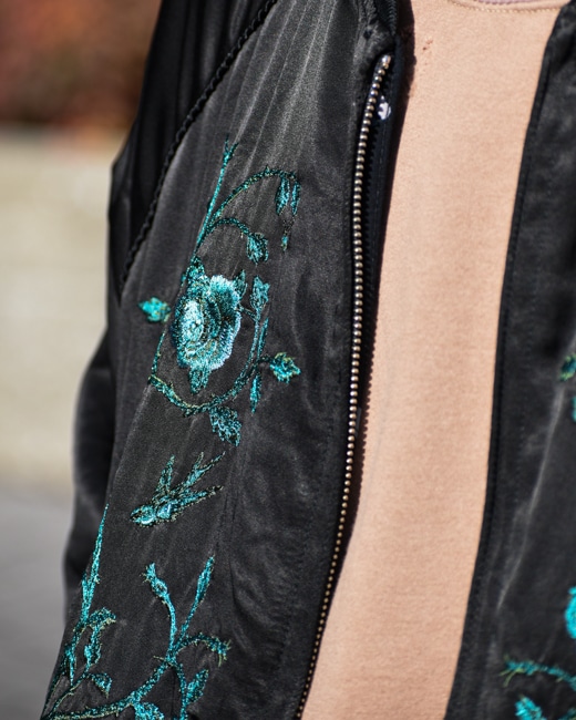 バラ、蜻蛉、燕をハイクオリティな刺繍で表現し、