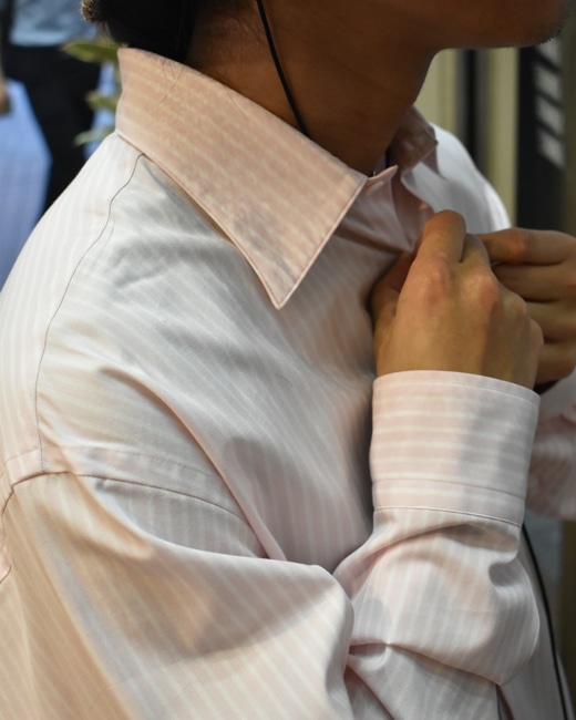 極細運針によって仕立てられたレギュラーカラーシャツ。