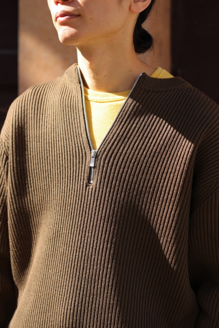 首元がスッキリとしたクルーネックタイプで、ジップの開閉で印象がガラッと変わり、レイヤードも楽しんで頂ける1着です。
