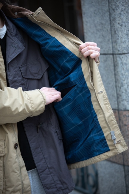 裏地にはクラシックな雰囲気のチェック柄のコットンクールマックスを使用していて、室内に入った時など暖かくなっても快適に着ていただけます。