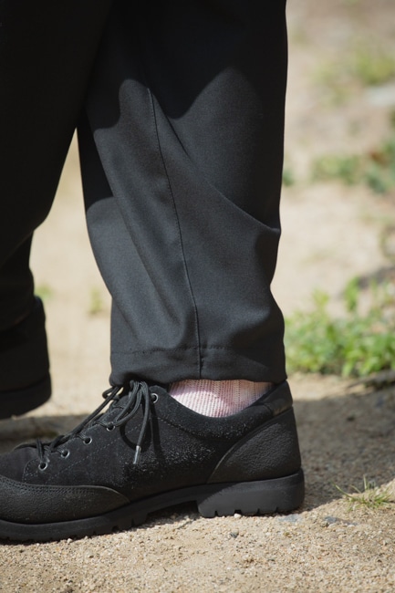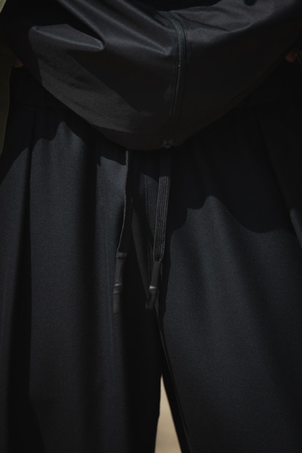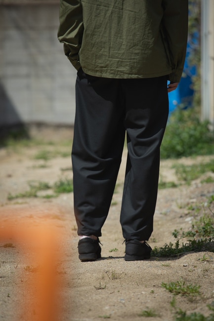 フロントにはタックが入り立体的な表情を持ち、素材の落ち感により裾の溜まり具合も綺麗に。