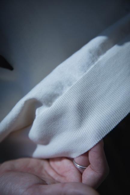 シーアイランドコットンの上品な光沢感と滑らかさが特徴的で、ニットながらに清涼感があり軽く柔らかい着心地です。