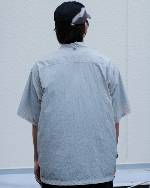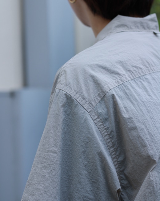 光沢感が特徴的なワッシャーナイロンタフタ生地を使用したオープンカラーシャツ。