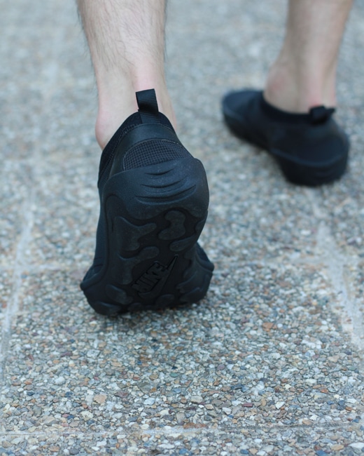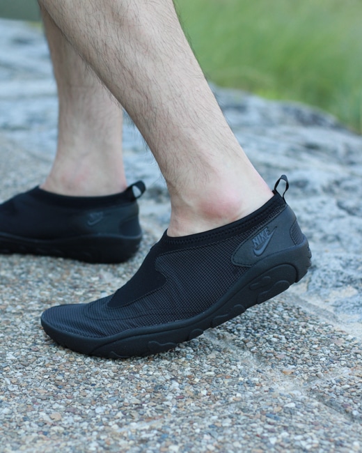 ナイキのシューズは薄型で水濡れに強く、伸縮性のあるアッパーが手袋のようにフィットし、素足感覚の履き心地でどんな環境でも履くことができ、どこにでも履いていける面構えのオールブラックも◎ですね。