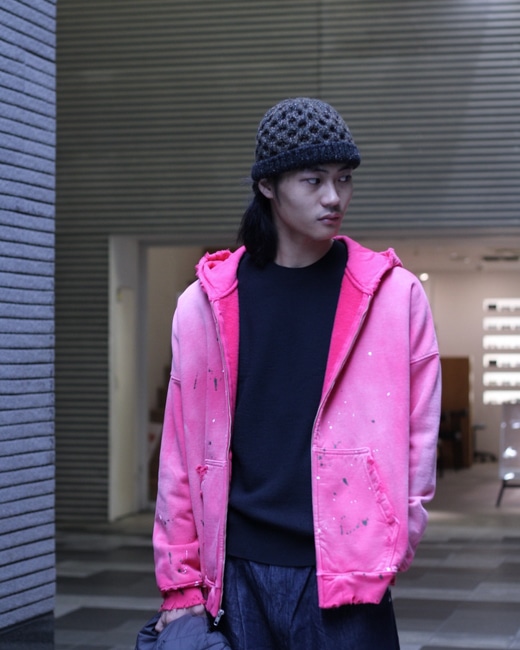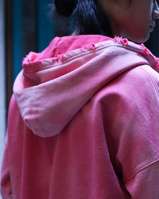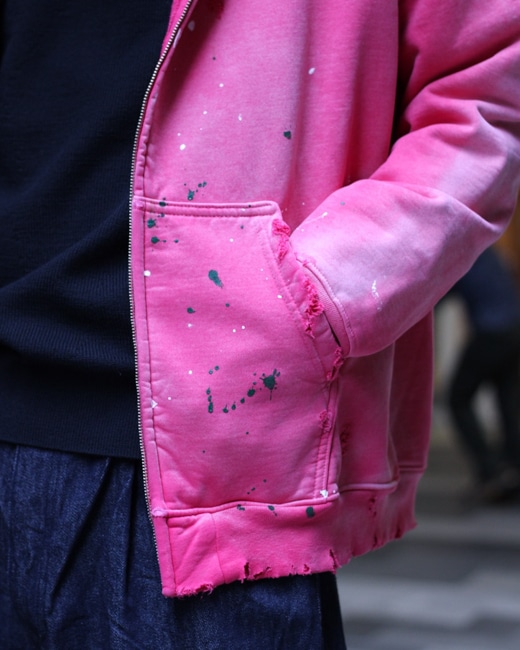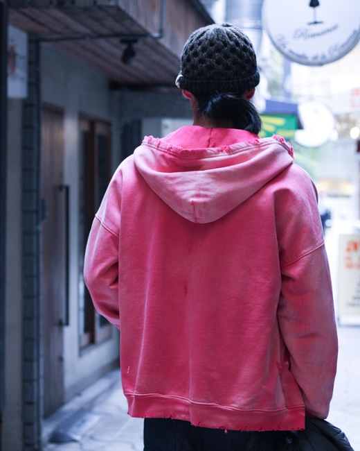 赤を強くフェードさせ、ピンクのような色味のジップアップフーディ。