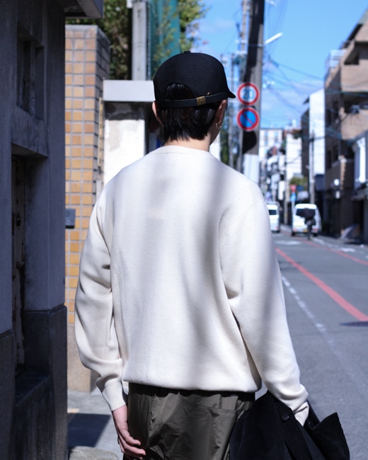 セットインスリーブで肩の落ちるリラックスシルエットですが、袖と裾部分のリブが効いていてメリハリのあるバランスの取れたサイズ感です。