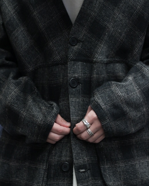 胸上の身頃から袖にかけて一枚生地で仕立てられていて、ハンティングジャケットのように肩の継なぎ目をなくすことで、ストレスのないゆとりのあるシルエットに。
