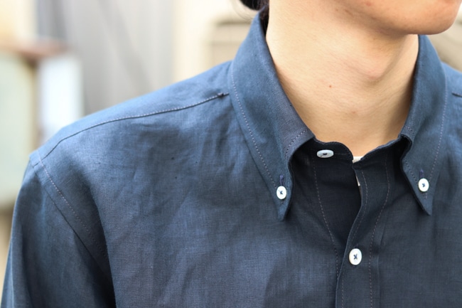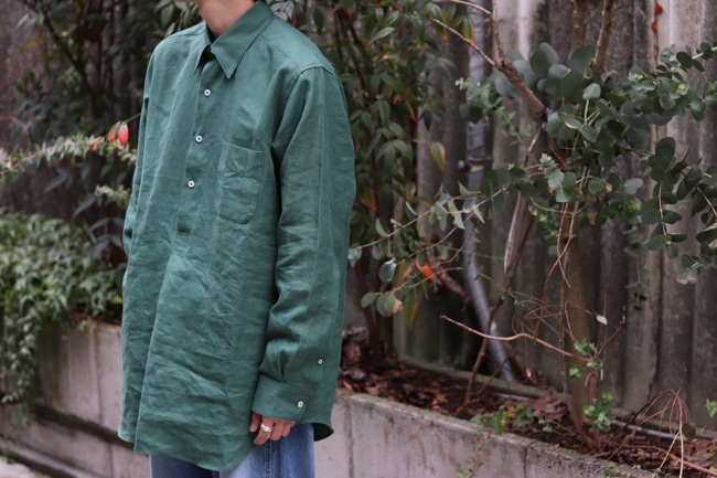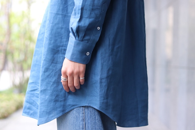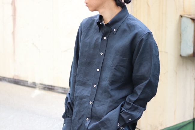 一般に流通しているリネン素材の生地とは明らかに異なる奥行きのある光沢感と肌触りが魅力で、春夏だけとは言わずに年中使っていただきたいもの。