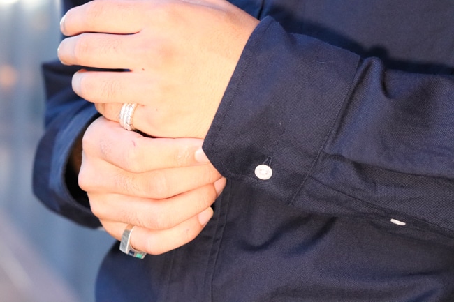 3 cm 間に 24 ~ 26 針というドレスシャツレベルのステッチワークで縫製し、襟やカフス、前立ての芯地は綿のフラシ芯を使用するなど、細部にまで一切妥協のない仕立て。