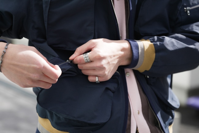 ボディにシンセティックレザーを重ねた前見頃には、左右2個ずつポケットが付き、こちらもデザインと機能性を両立させた1枚。