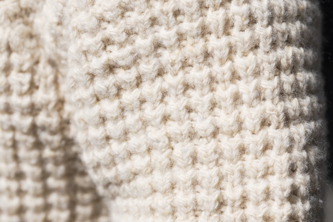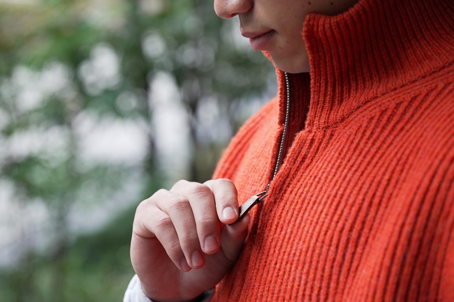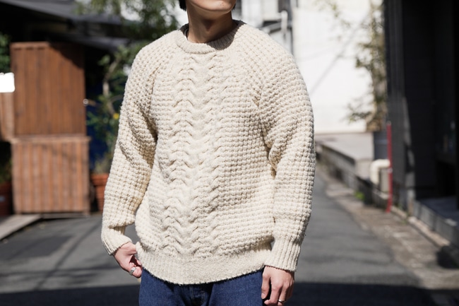 英式紡績の特徴でもある梳毛紡績により作られた糸は独特なハリと膨らみに秀でているので、この糸で製作されたニットはじんわりと体を温めてくれます。