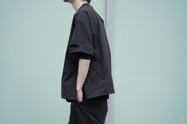 両サイドにはスラッシュポケット、左脇のサイドジップ、裾には調整用のスピンドルを採用し、一枚でも重ね着でも存在感のあるアイテムですので、今回は今の気分に任せて少しルーズなTシャツのレイヤードをしてみました。