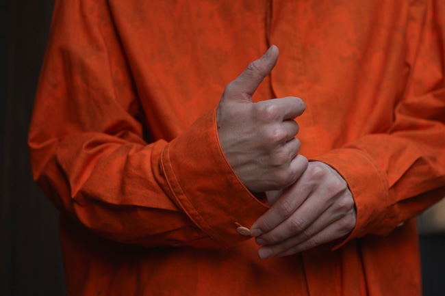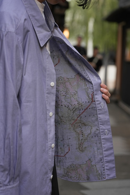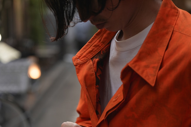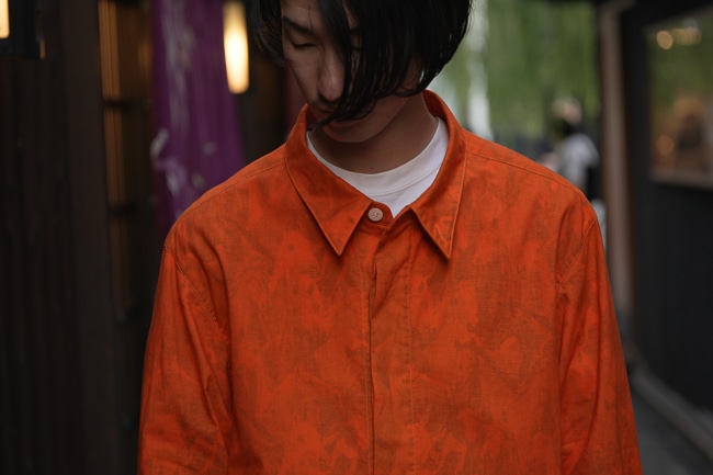 リバーシブルではないですが、インクジェットプリントを施した面を裏側に採用しておりますので少し見えるような着こなしをしていただくのも面白いかと思います。
