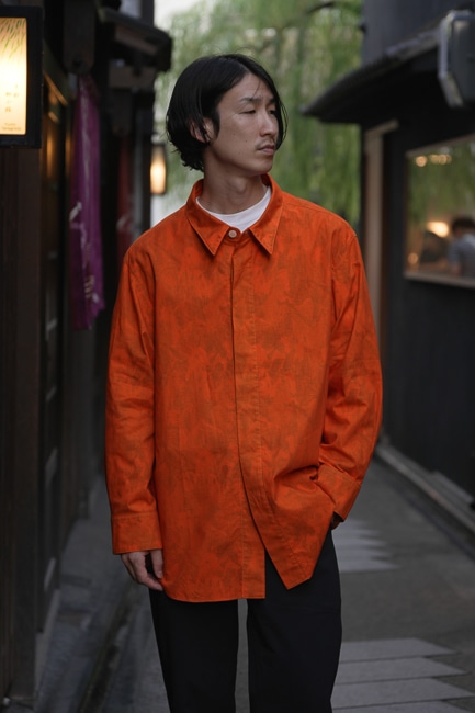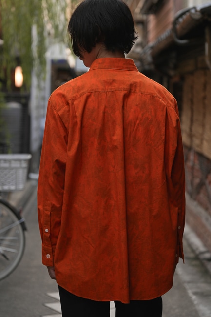 アメリカ製の綿ブロード生地にインクジェットプリントを施し、シャツに仕立てた後に製品をオーバーダイしたオーバーシャツ。