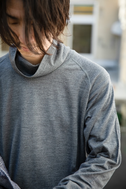 生地の繋ぎ部分はフラットシーマ製法を採用することで見栄えも良く、重ね着はもちろん一枚でも着ていただきたい仕上がりです。ネック部分は生地を二重にしているので、さらに折り返してオフタートルのような着方もしていただけます。