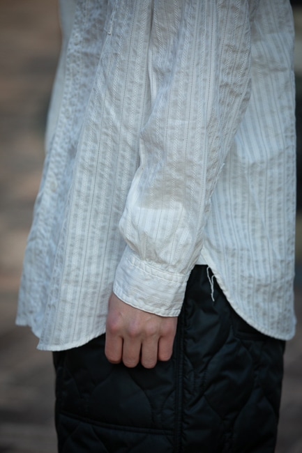 しかもまず見たことのないメッシュジャガード生地です。肌寒い今の季節ではニットの下に、暖かくなればデニムジャケットやアウターベストに合わせていただければ新鮮かと思います。