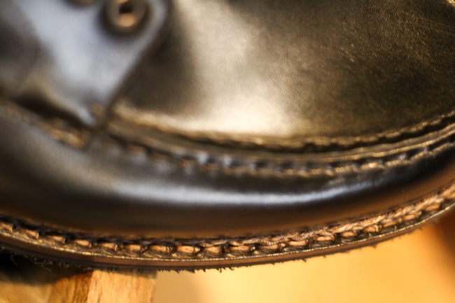 アッパーとソールを繋げる出し縫いのステッチの上にこの装飾がなされると一気に無骨な佇まいに。