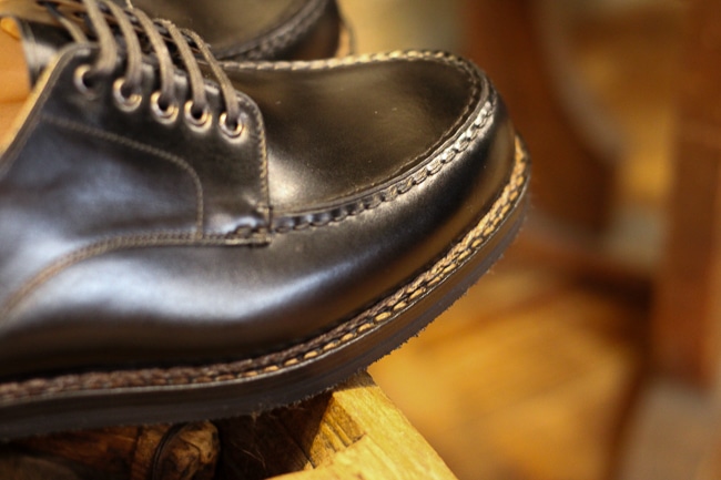 5アイレットのハトメの間隔や履き口とノーズのバランス、ピッチの細かいダブルステッチなどが”道具”として、フランスのDuPuy社のキメの細かさと力強さが同居する美しい革ANILOU CALFやハンドメイドによる仕立てが”伝統工芸品”としての顔を覘かせてくれます。