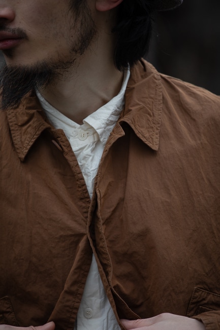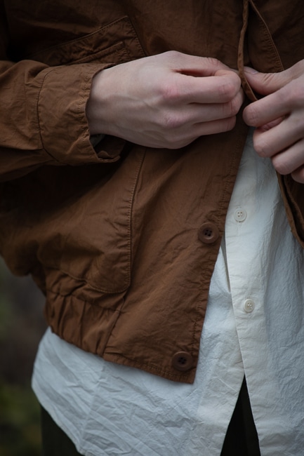 裏地の生地もブランドを代表するペーパーコットン。高密度に織られたコットンの生地を独自に加工することでまるで和紙のような質感に仕上げた他にはない生地です。表はCASEY CASEYには珍しい綿ポリ。こちらも独自の染色と加工を施してワックスを入れたかのような雰囲気に仕上げています。