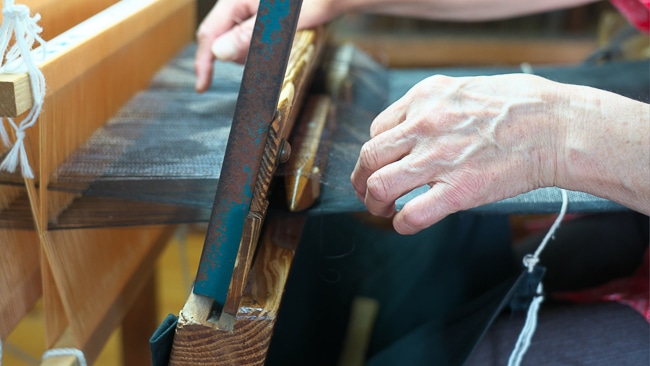 しかしこの染料だけでは美しい色合いに染まらないのが興味深いところで、テーチ木から抽出した染料で染めた糸を、鉄分を多く含む泥田にじっくり浸すことでテーチ木染料に含まれるタンニン酸色素と鉄分が化学反応し、ようやく風合いある黒茶色に染まるのです。