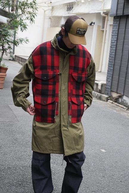 ワークやアウトドアを象徴するジャケットやミリタリー要素を秘めたコートがラインナップされており、大胆な素材の切り替えや加工、パッチワークを施した独自のアプローチは、自然に向き合いながら逞しく生きる労働者への敬意と先人達の生き様をまるで洋服というキャンバスに落とし込んだかのようです。
