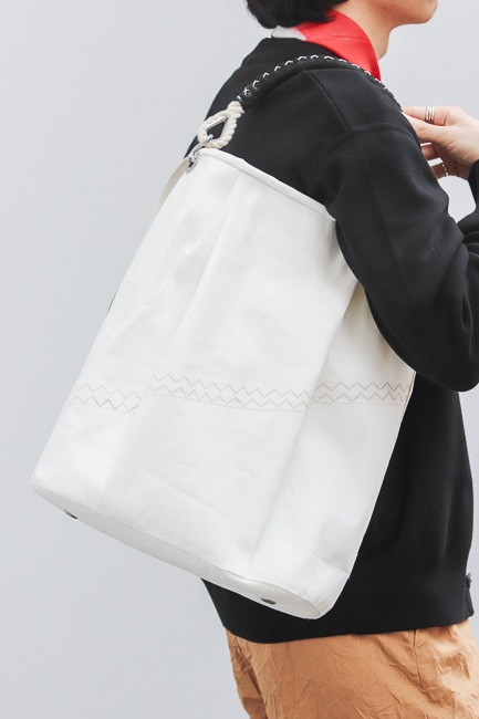 メインファブリックには70年代~80年代のセイルクロス、ハトメや留め具の金属パーツもヴィンテージのものを使い、ヴィンテージならではの表情とハンドメイドによる一点ものならではの雰囲気が魅力です。