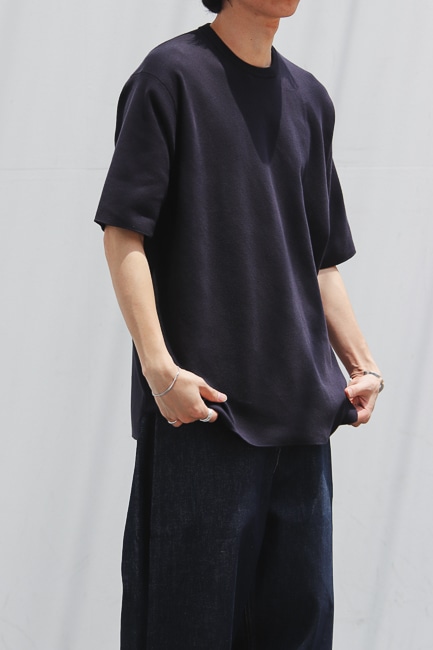 上質なコットン強撚糸を、世界で最もハイゲージといわれる貴重な32ゲージの横編み機で編み立てたスムース編み。