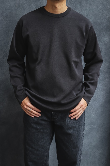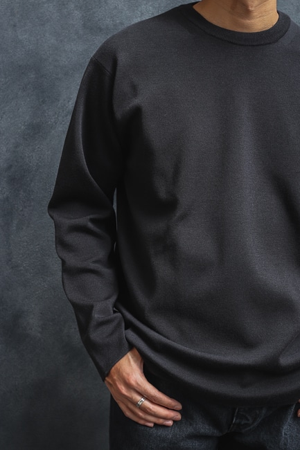 世界最高峰のハイゲージ編機で極細番手のウール糸を時間をかけてスムース組織で編立てした「Men 32G Smooth Wool Crew Neck」。