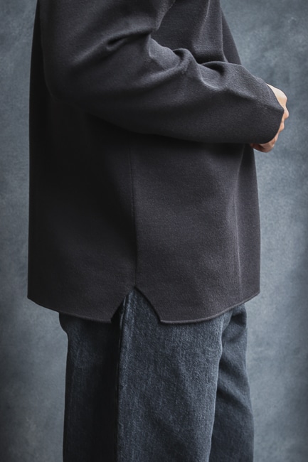 袖や裾にはリブが無いので、セーターというよりカットソーくらいの感覚で気軽に着ていただけるのもポイントです。
