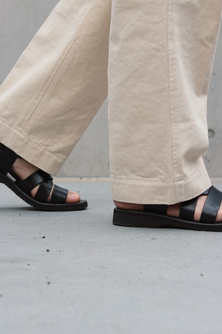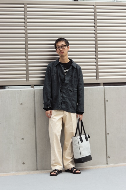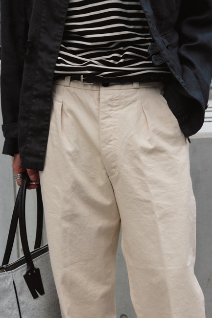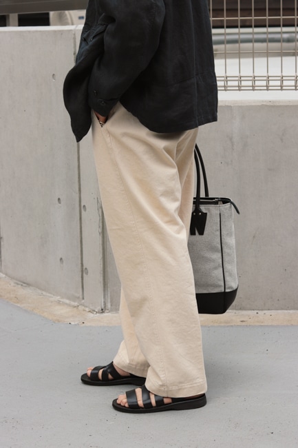 双糸のラミーを緩いテンションで織ることで、綾目を立たせながらラミー特有の光沢感も感じられるオリジナルツイル生地を使用。