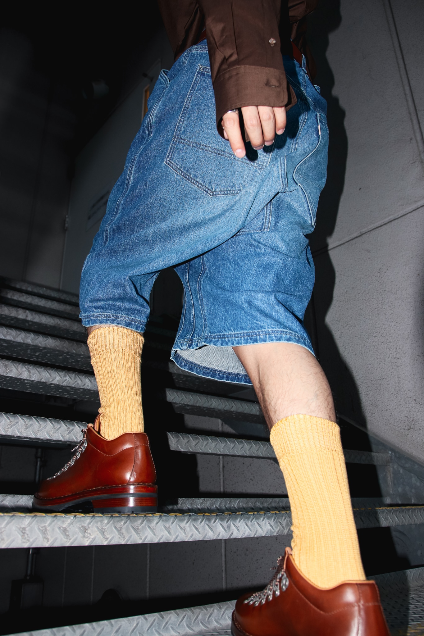 リング紡績した米綿をシャトル織機で織り上げた12.5ozのセルビッチデニムを使用しているバギーショーツ。
