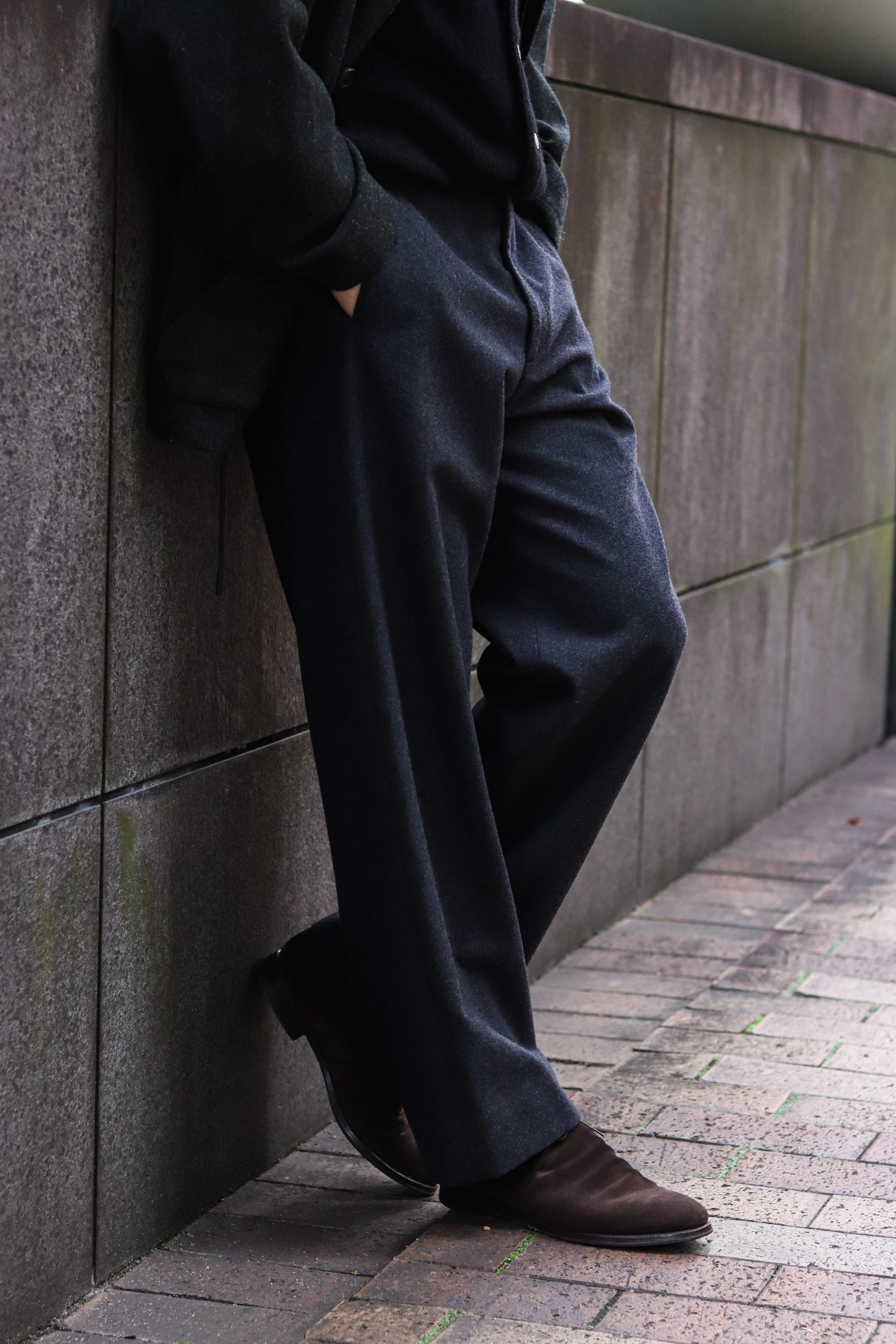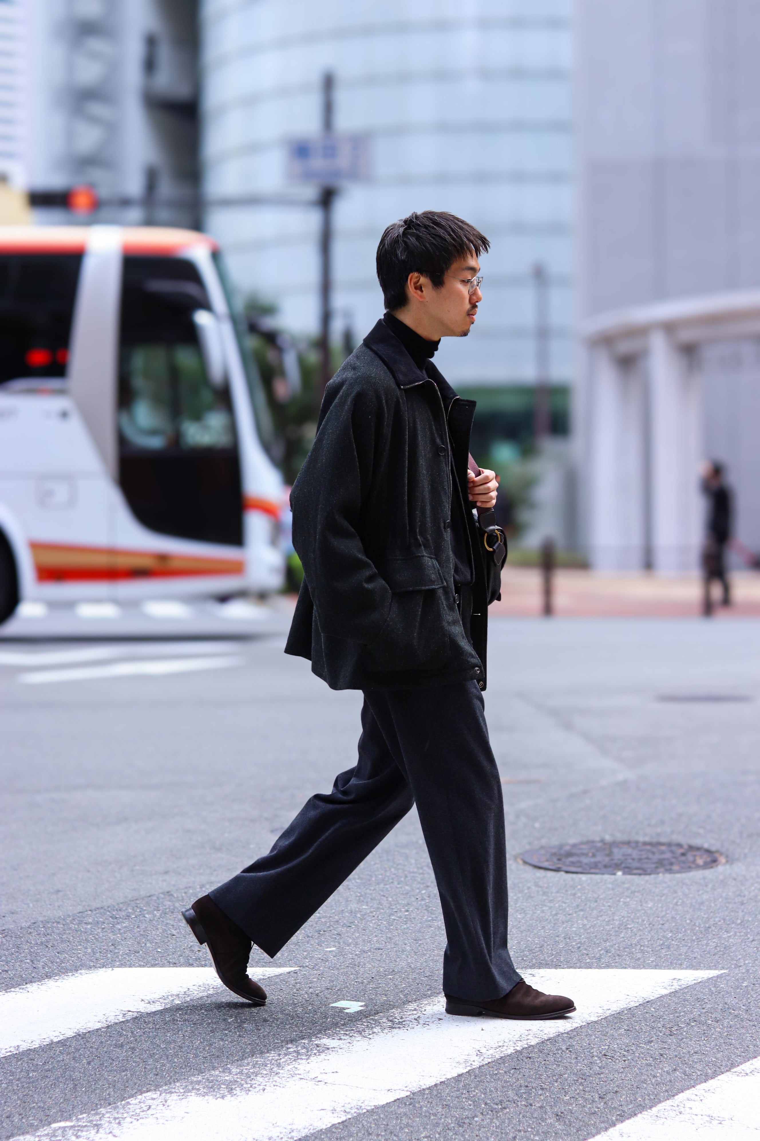生地は英国のツイードに敬意を感じるウールのソフトツイードを使用しており、