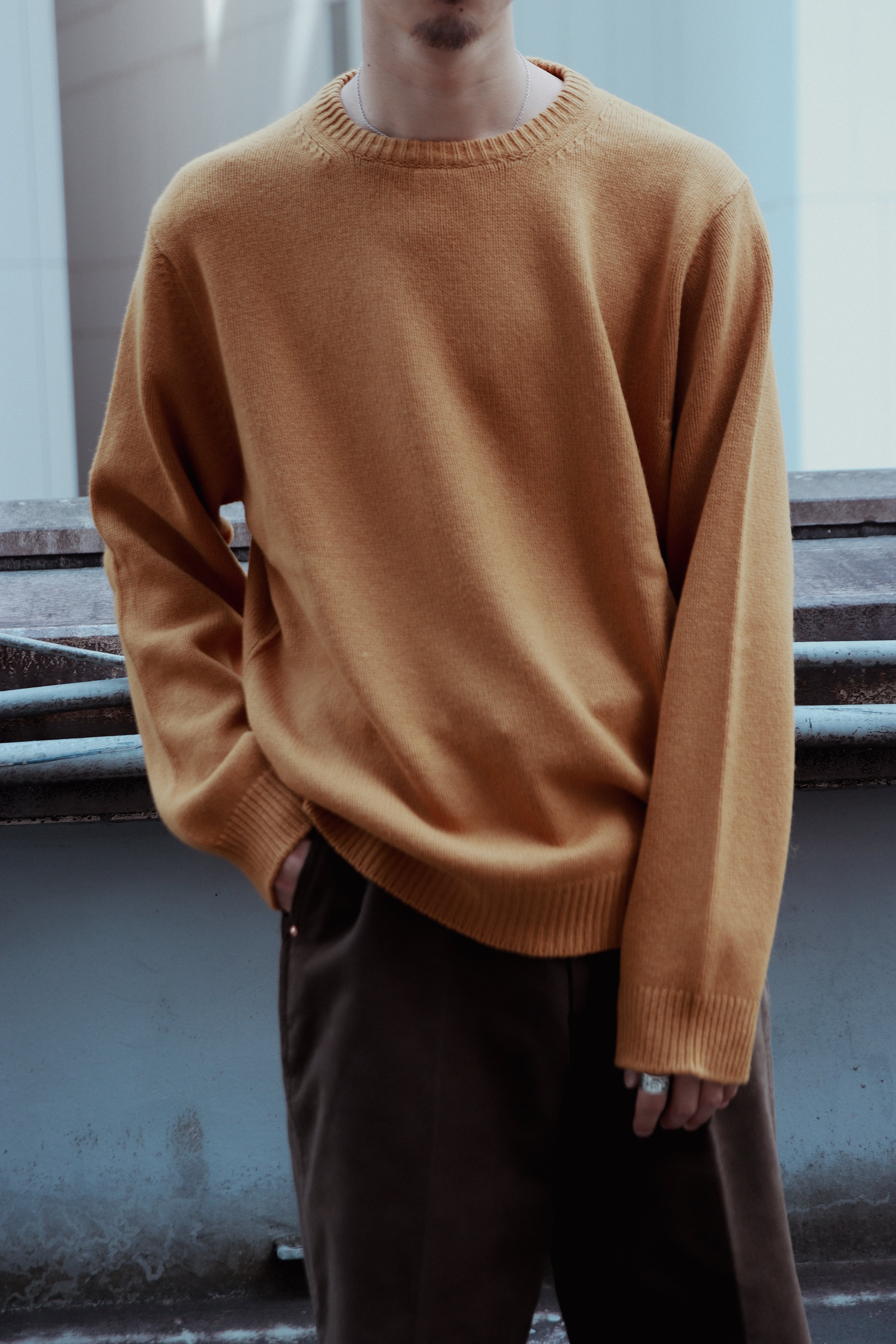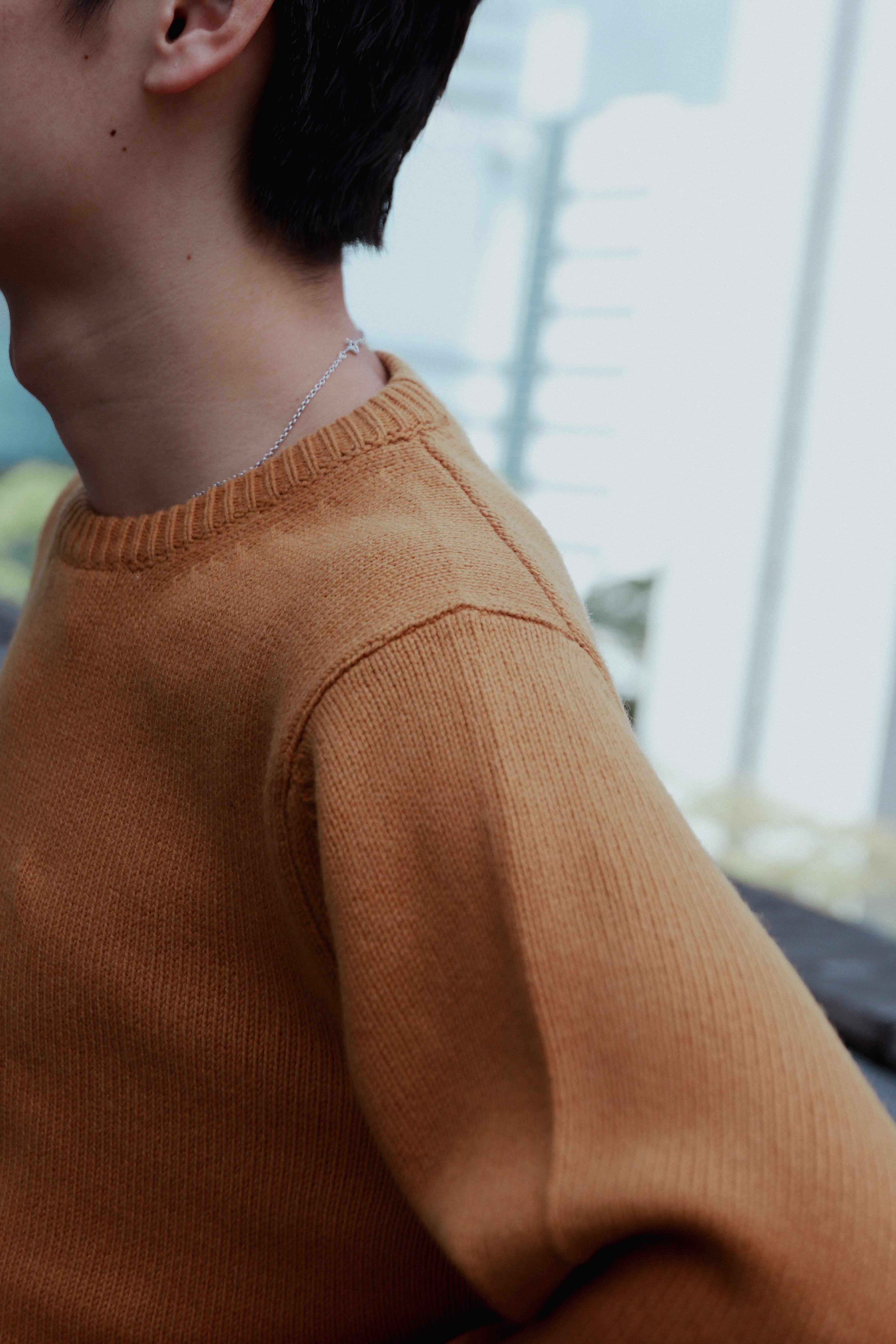 シルエットはゆったりとしたボックスシルエットでセットインスリーブのクルーネックセーター。