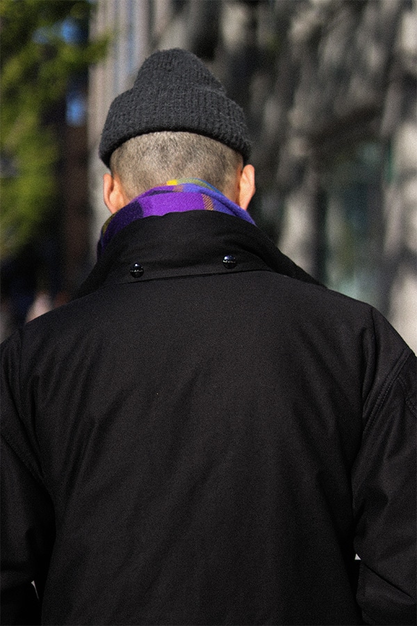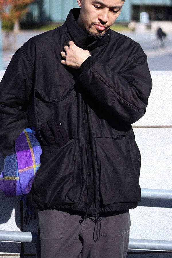 コチラのジャケット一枚でも十分な保温性がありますが、中に肉厚なセーターやスウェット等を着込んでもストレスの無いゆったりとした着心地のジャケットです。