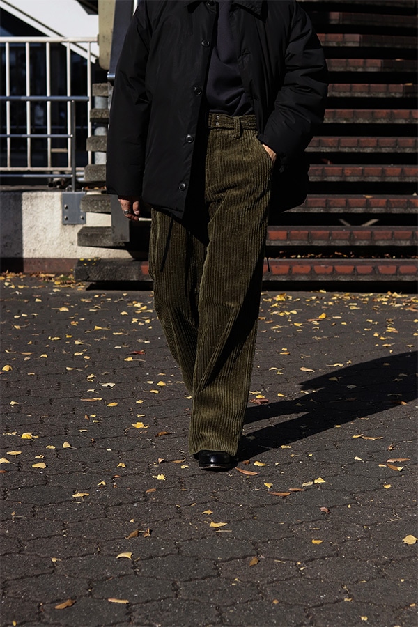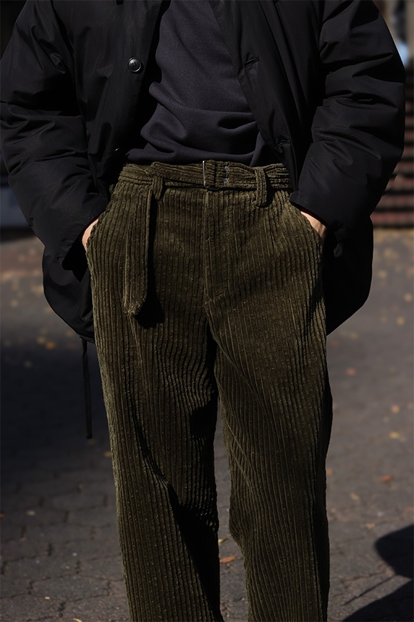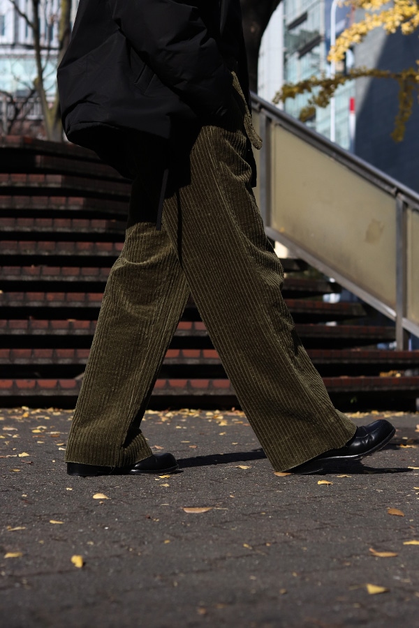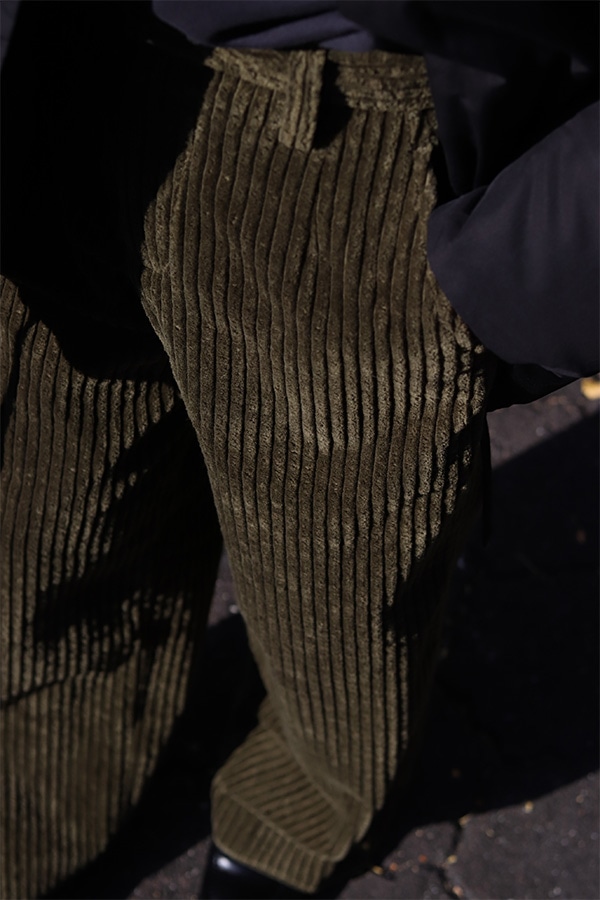 迫力のある畝とワイドシルエットながら、合わせるアイテムを選ばず、日常のスタイルに溶け込む万能な一本。