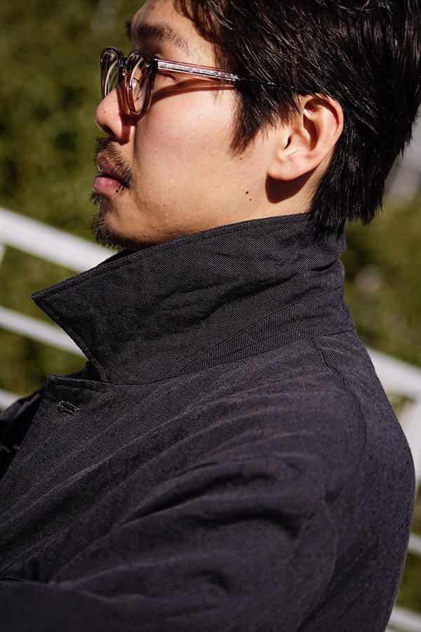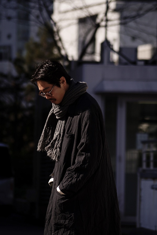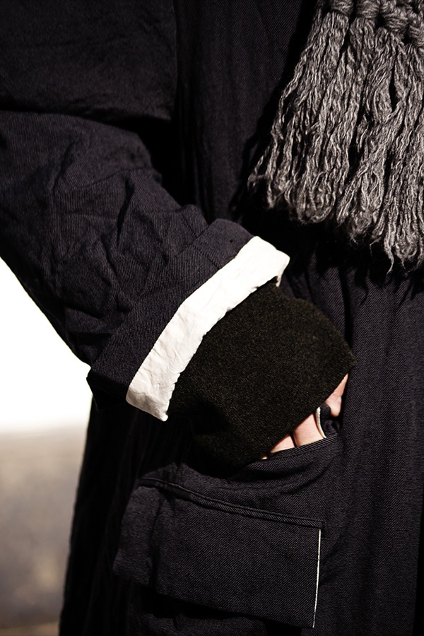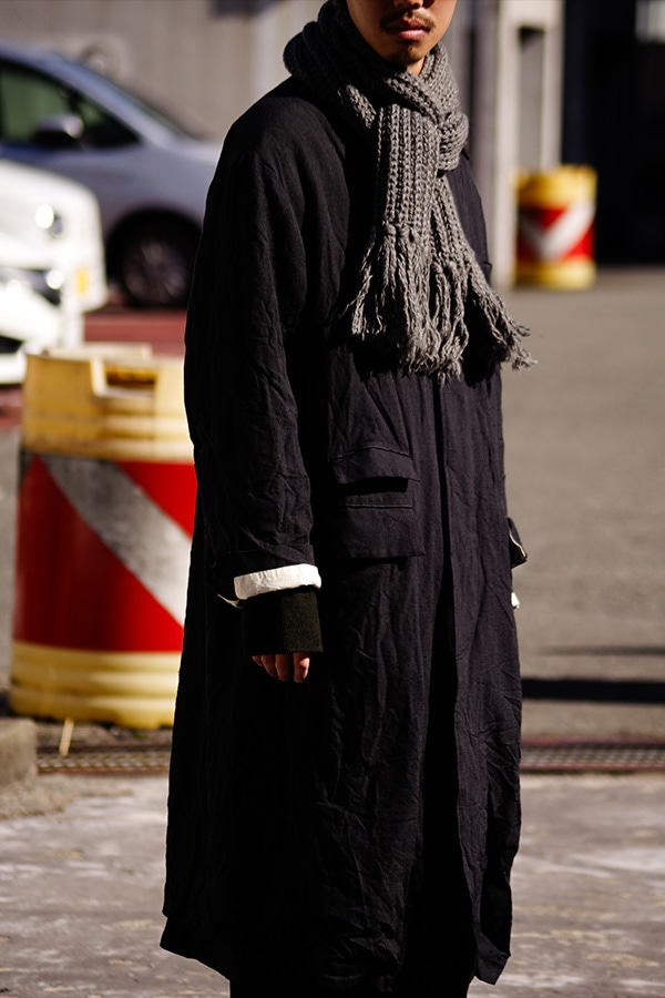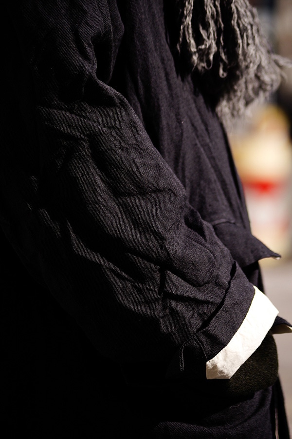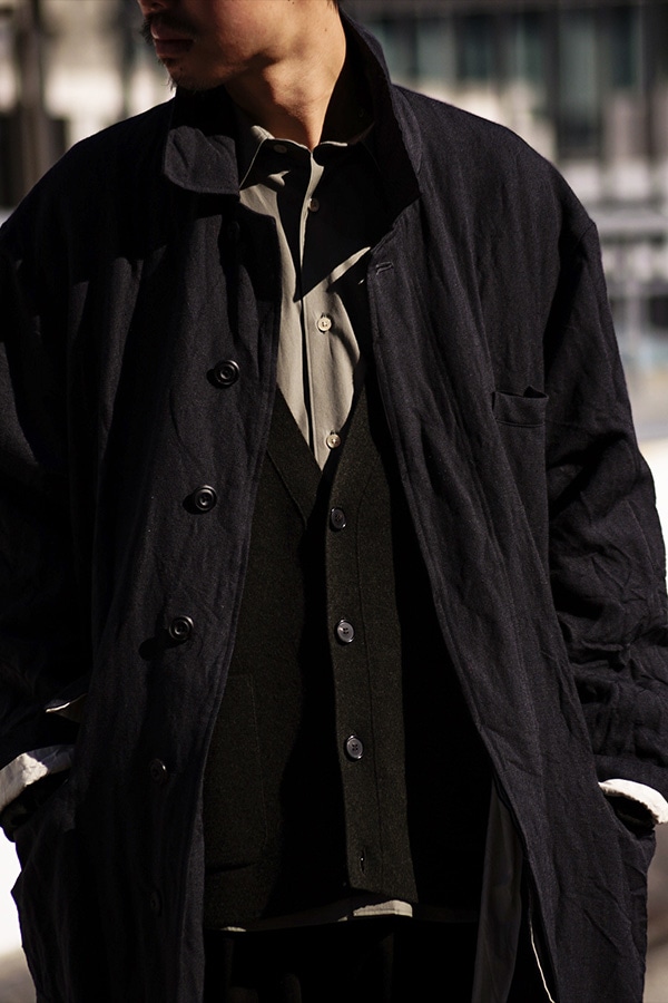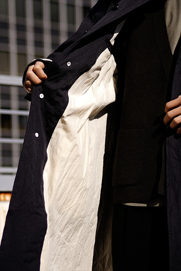 縮絨によって生まれる陰影と、ウールリネン特有のハリのある素材感。それをロングコートに落とし込むことで、抜群の雰囲気を纏います。