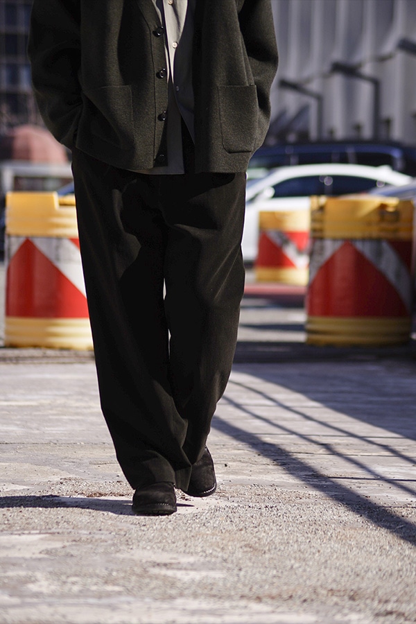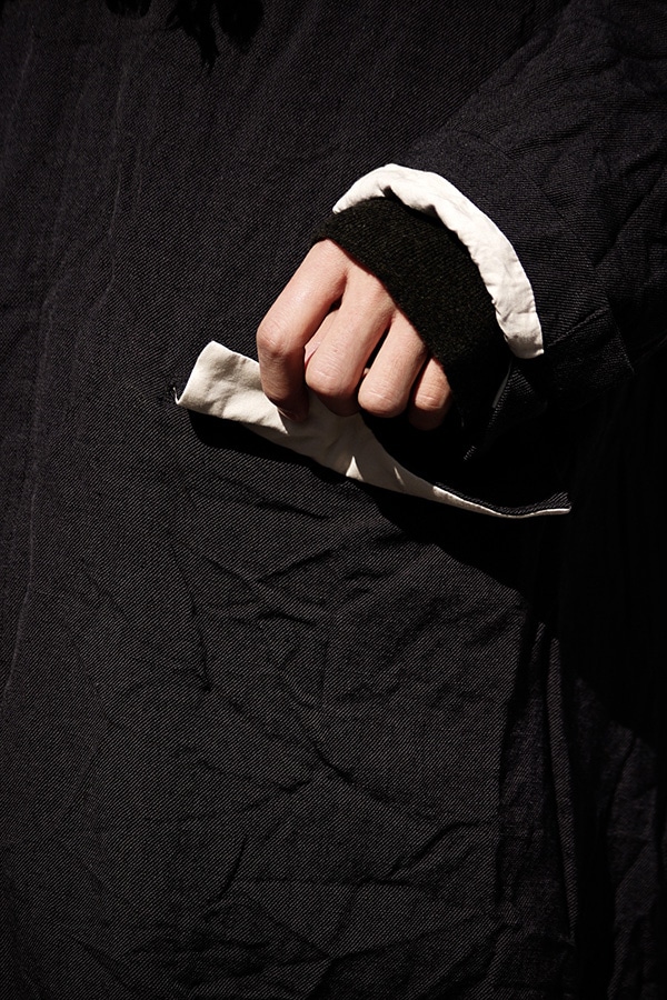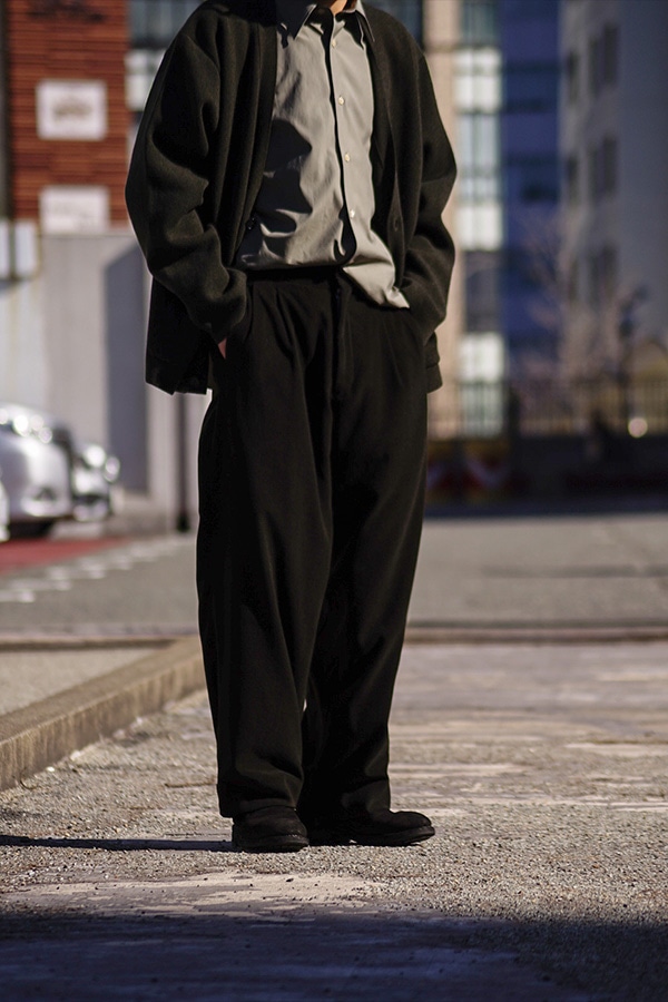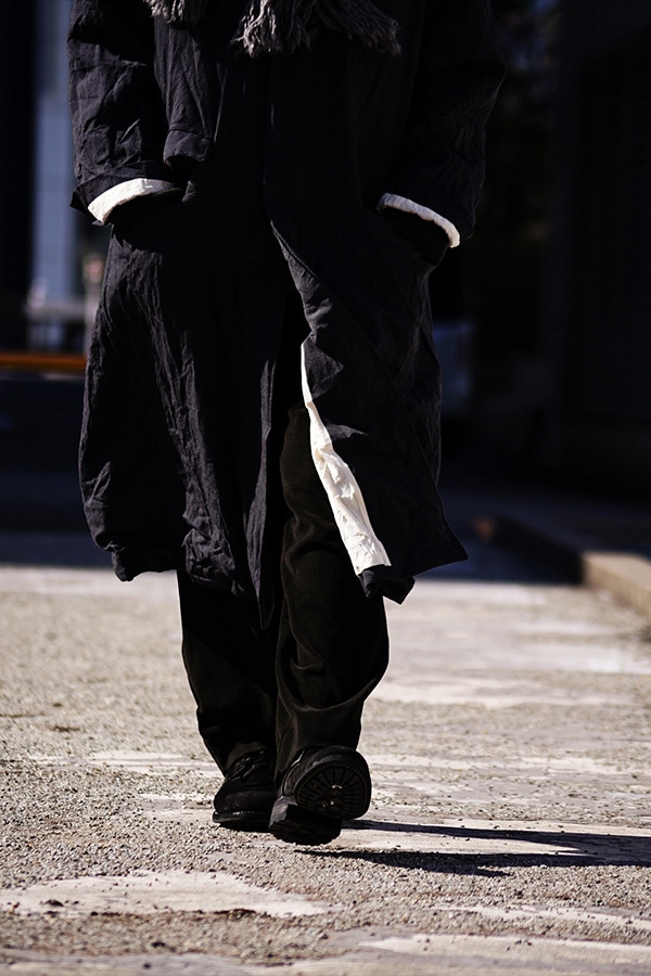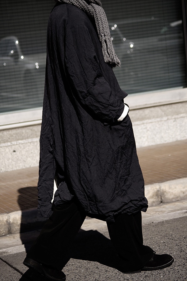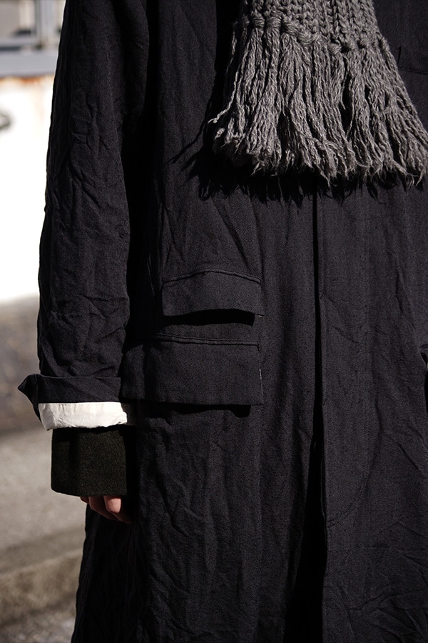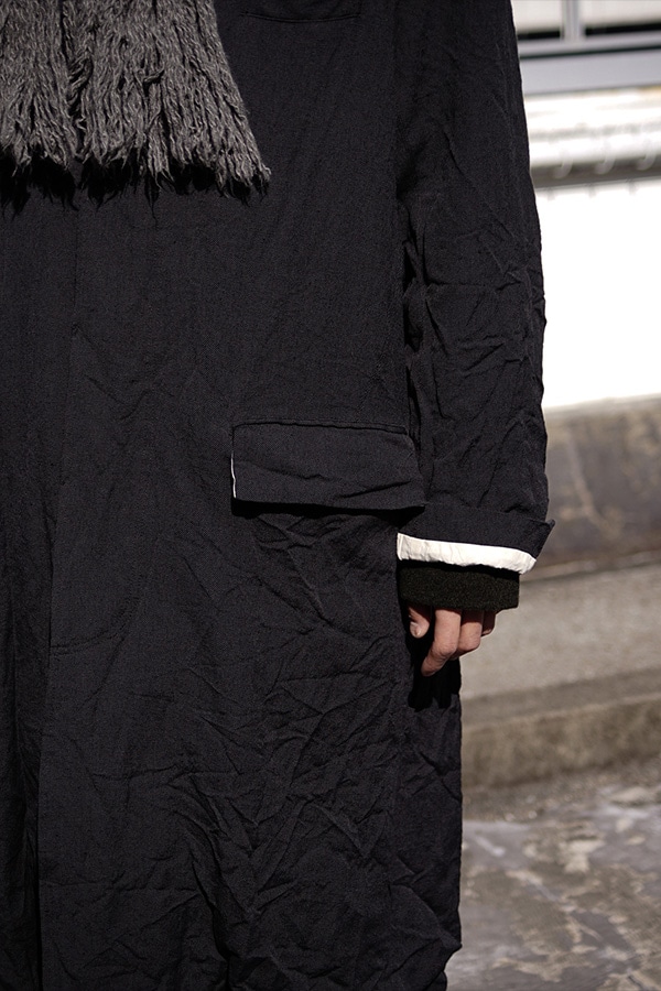 縮絨によって生まれる陰影と、ウールリネン特有のハリのある素材感。それをロングコートに落とし込むことで、抜群の雰囲気を纏います。