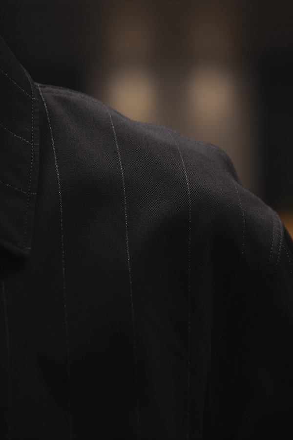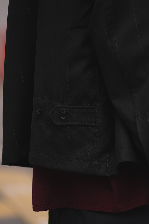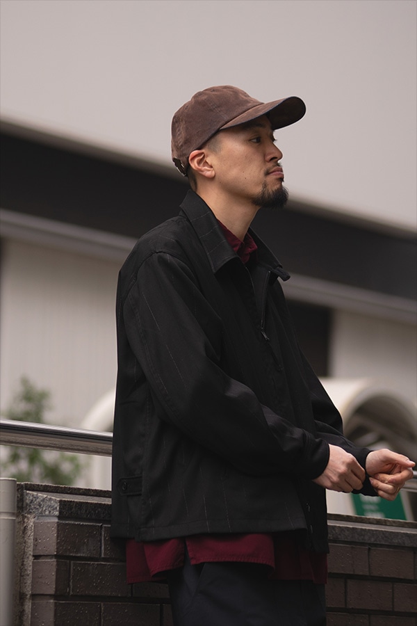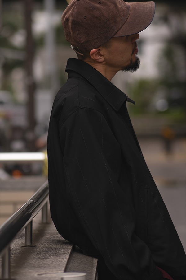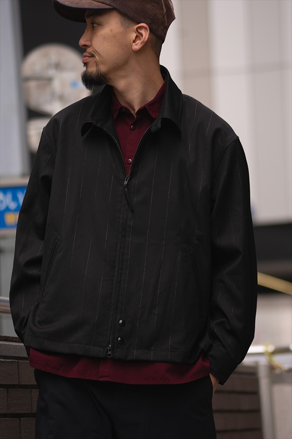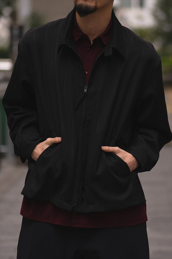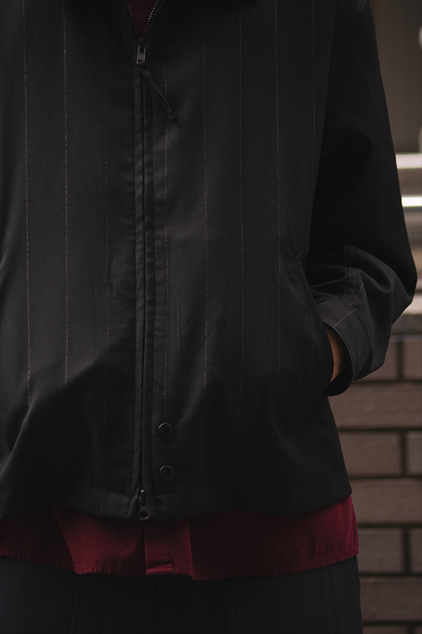 ラメ糸を使用したドレープ感のあるストライプ生地は、どこかラグジュアリー感があり、ハードになりやすいブルゾンジャケットとは一線を画すアイテムです。