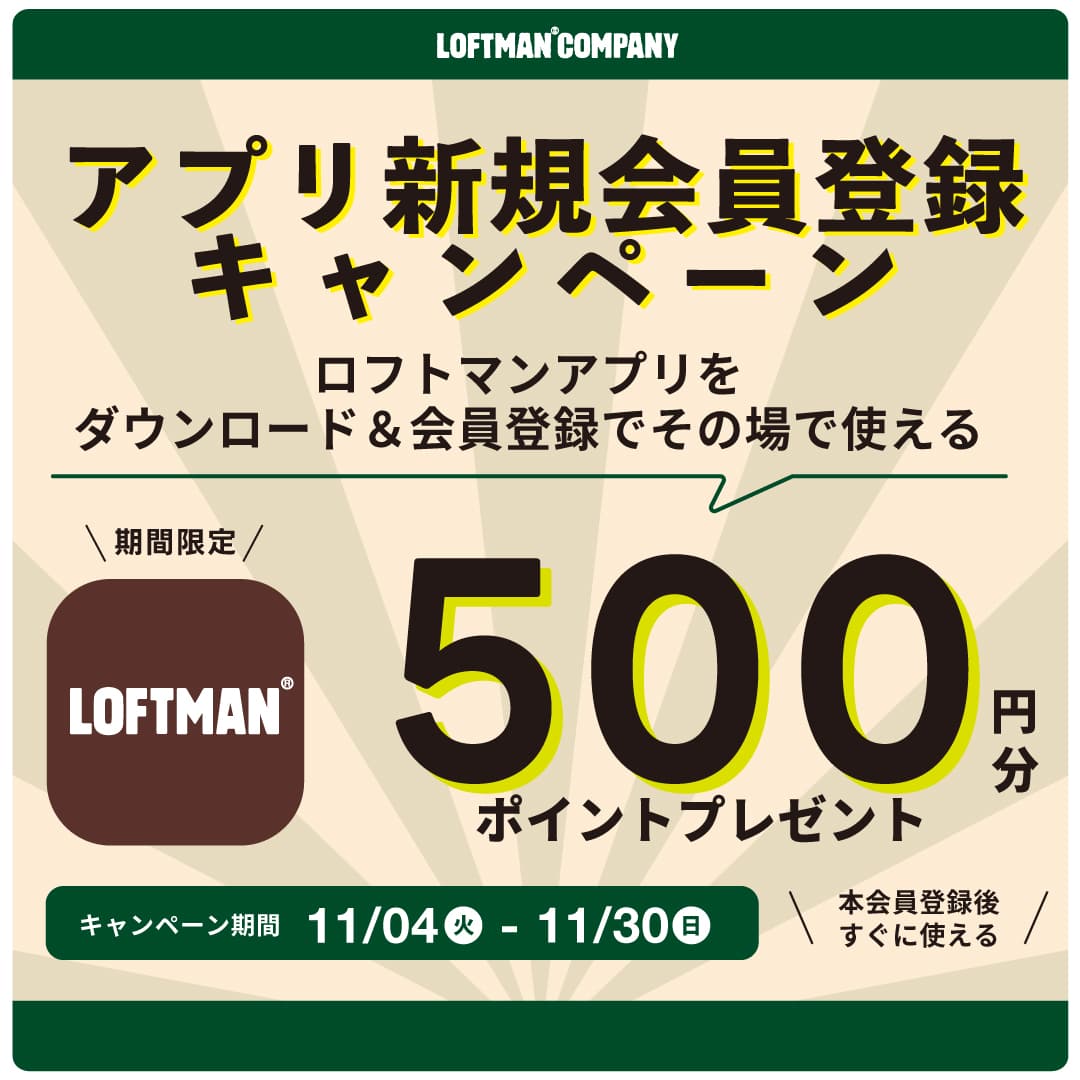 期間中、ロフトマンのアプリをダウンロードいただき、新規会員登録していただいたお客様に500円分のポイントをプレゼントしております。