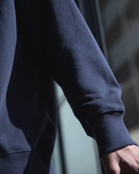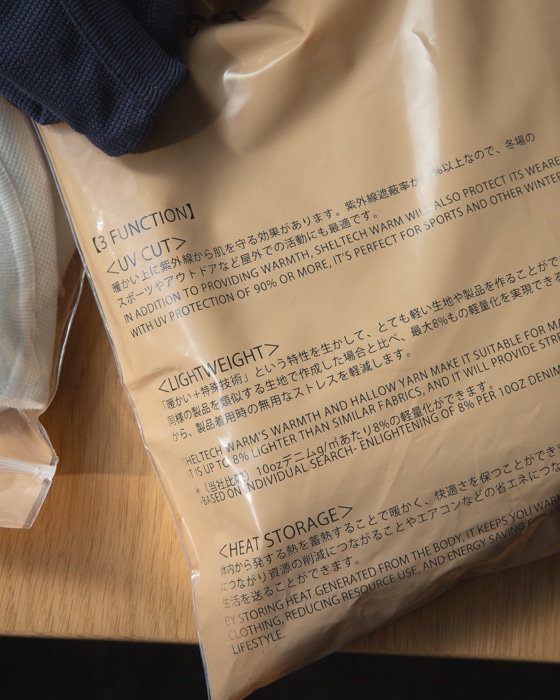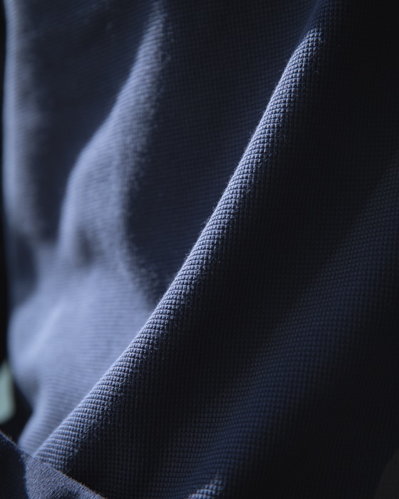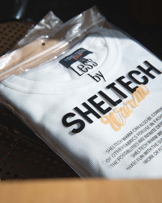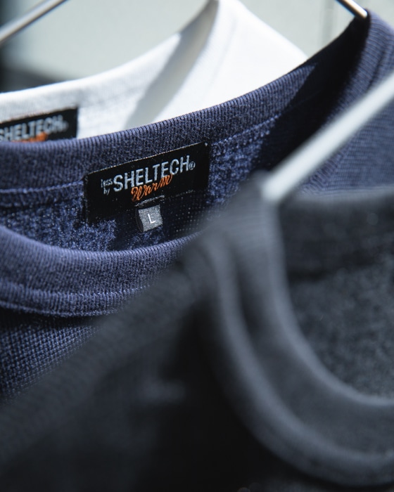 「太陽と遊ぶ」というコンセプトのもとSHELTECHは誕生しました。それは炎天下の中でも涼しく自由に動き回ることができる素材。【1.遮熱 2.接触冷感 3.吸水速乾 4.軽量 5.紫外線防止】の5つの機能全てを備えています。素材のもつ5つの機能が開発当初から全て意図されていたわけではありません。SHELTECHのもつその特殊な糸の成分と構造が、結果として軽量と紫外線防止という二つの副産物を産みました。それらは素材の活躍の幅をさらに広げます。もう一つの特徴はSHELTECHが様々な異なる素材との組み合わせに対応できることです。アプローチ次第で最終製品の可能性は無限大。ファッションからスポーツ、ワークウェアまで。太陽と遊ぶ。