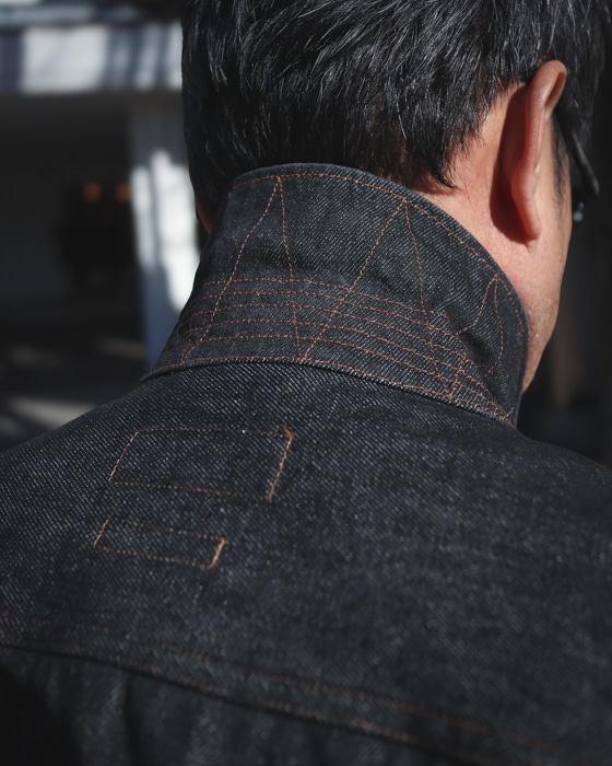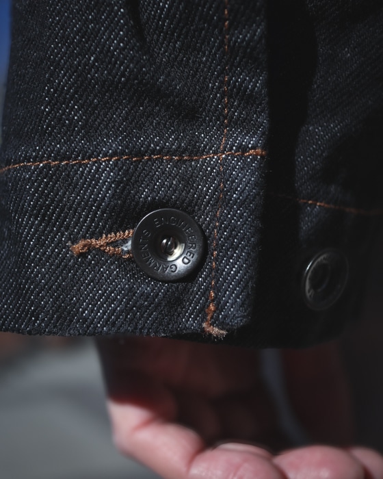 質実剛健な14オンスのコーンデニム社製素材のブラックボディと掛け合わされた金茶色のステッチカラーと相まり、