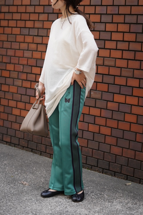 メンズライクな洋服をフェミニンに楽しんでいる彼女です。
